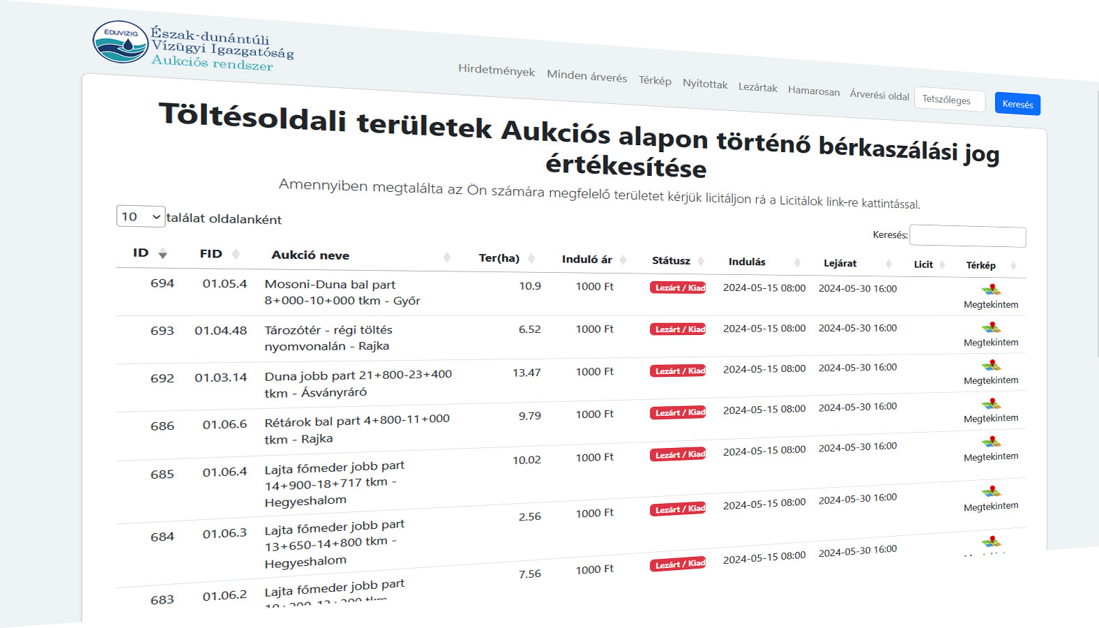 Jelenleg működő felületünket elérheto a www.eduvizigaukcio.hu portálon amely a Győr-Moson-Soproni árvízvédelmi töltés mentén keletkezett fű bérkaszálási értékesítését támogatja.